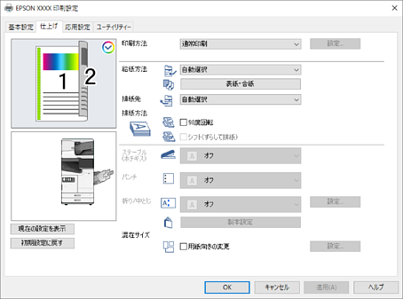 製本のとじ方、中とじしろ、表紙の印刷、ページ番号などを設定できます。