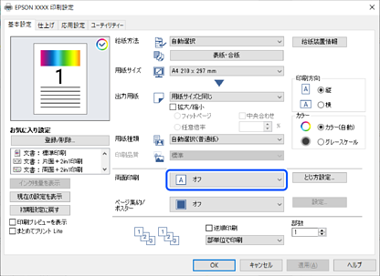 プリンタードライバーの画面を表示して、[基本設定]タブの[両面印刷]から[オフ]を選択します。