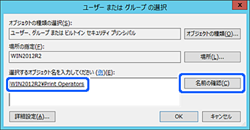 グループやユーザーの完全な名前がわからない場合は、名前の一部を入力して[名前の確認]をクリックしてください。名前の一部が合致するグループやユーザー名が一覧表示され、そこから選択することができます。