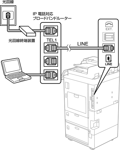 IP電話対応のブロードバンドルーターとプリンター背面部のLINEポートをモジュラーケーブルで接続します。詳しくはご契約の回線事業者に問い合わせてください 。