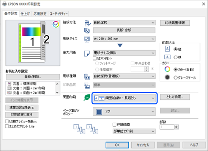 プリンタードライバーの画面を表示して、[基本設定]タブの[両面印刷]から[両面(自動) - 長辺とじ]を選択します。