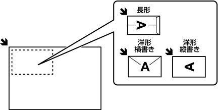宛名面を下にして、原稿台にセットしてください。封筒をセットする場合は図の向きで封筒を置いてください。
