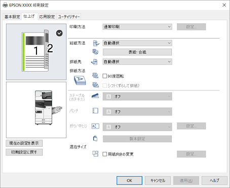 [基本設定]タブや[仕上げ]タブ、[応用設定]タブで設定されている項目を一覧で表示します。現在の設定一覧画面を表示、または非表示にすることができます。