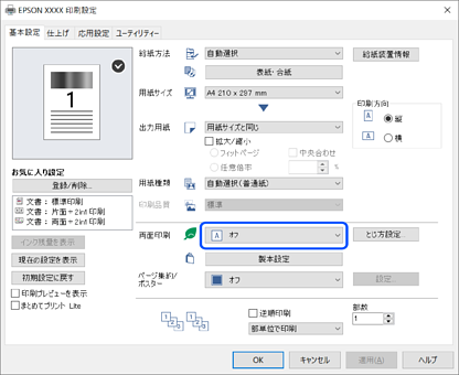 プリンタードライバーの画面を表示して、[基本設定]タブの[両面印刷]から[オフ]を選択します。