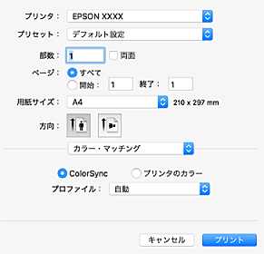 色補正の方法を選択します。プリンターで色の調整を行い、異なるデバイス間の階調を近づけることができます。