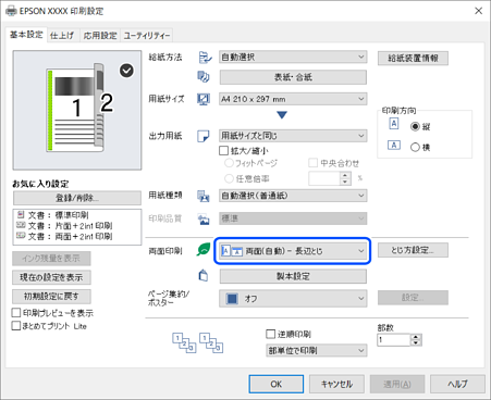 プリンタードライバーの画面を表示して、[基本設定]タブの[両面印刷]から[両面(自動) - 長辺とじ]を選択します。