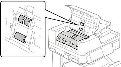 水を含ませた柔らかい布を固く絞って、ローラー部など内部に付着している紙粉やゴミ、ホコリなどを拭きます。