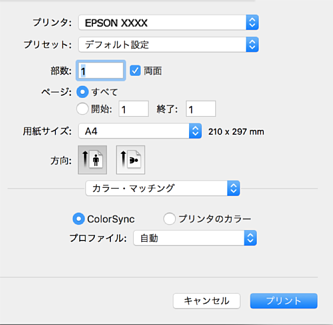 色補正の方法を選択します。プリンターで色の調整を行い、異なるデバイス間の色合いを近づけることができます。