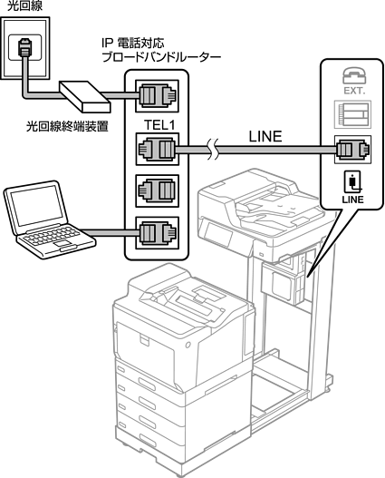 IP電話対応のブロードバンドルーターとプリンター背面部のLINEポートをモジュラーケーブルで接続します。詳しくはご契約の回線事業者に問い合わせてください 。