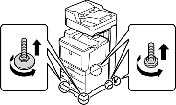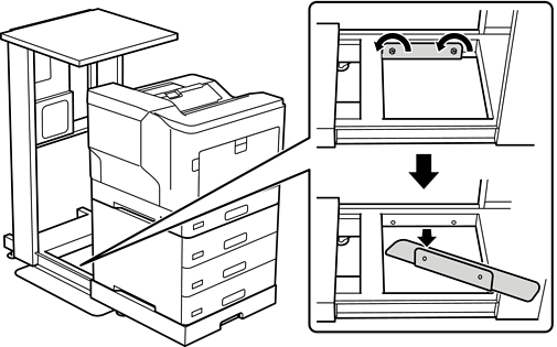 移動後フロアマットやカーペットの上などに設置する場合、転倒防止脚が浮いてしまいネジが締まらないことがあります。プリンターと増設カセットユニットを取り外してから、転倒防止脚を取り付けてください。