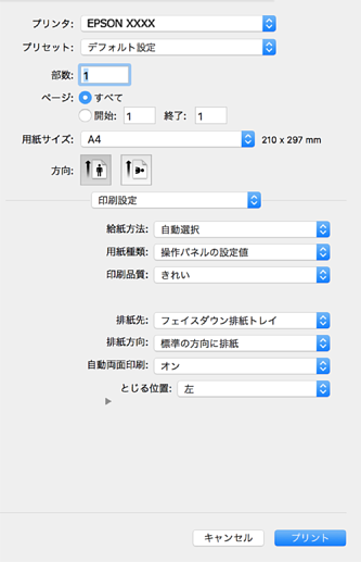 macOS Catalina (10.15)以降、macOS High Sierra (10.13)、macOS Sierra (10.12)、OS X El Capitan (10.11)、OS X Yosemite (10.10)、OS X Mavericks (10.9)、OS X Mountain Lion (10.8)で[印刷設定]メニューが表示されないときは、エプソンのプリンタードライバーが設定できていません。以下の方法で設定してください。