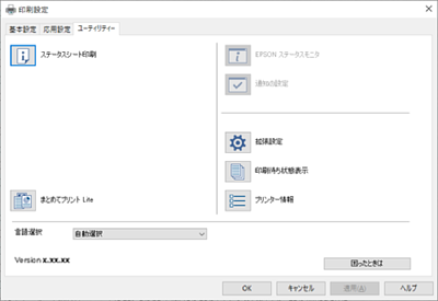 EPSON ステータスモニタの画面を表示します。プリンターや消耗品の状態が確認できます。この機能を有効にするにはEPSON ステータスモニタをインストールする必要があります。エプソンのウェブサイトからダウンロードできます。