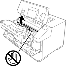 プリンター内部の注意ラベルで示す部分に触れないでください。内部は高温になっているため、火傷のおそれがあります。