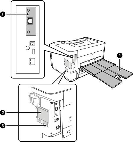 背面に取り付けて、用紙を250枚(64 g/m2)まで保持できます。 |