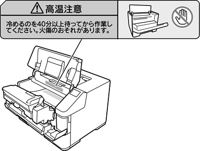 プリンター内部の注意ラベルで示す部分に触れないでください。内部は高温になっているため、火傷のおそれがあります。