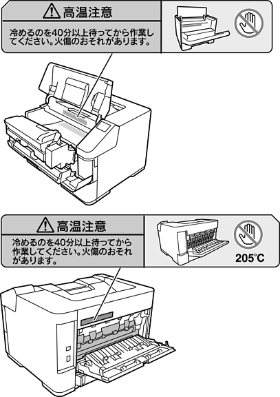 プリンター内部の注意ラベルで示す部分に触れないでください。内部は高温になっているため、火傷のおそれがあります。