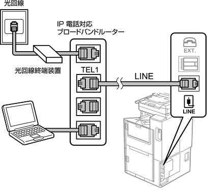 IP電話対応のブロードバンドルーターとプリンター背面部のLINEポートをモジュラーケーブルで接続します。詳しくはご契約の回線事業者に問い合わせてください 。
