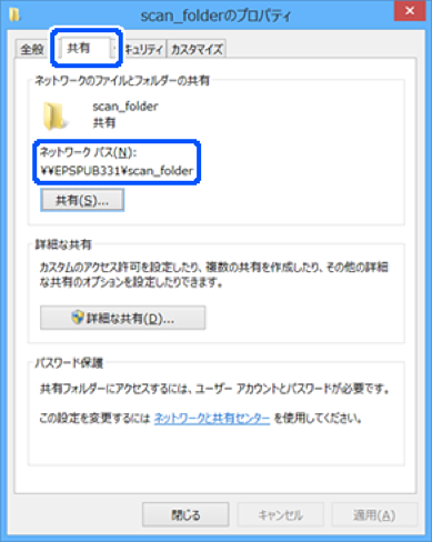 共有フォルダーのネットワークパスが表示されます。このパスをプリンターのアドレス帳の登録で使用します。メモやコピーをしておいてください。