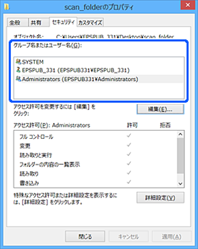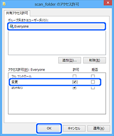 7. グループ名またはユーザー名]の[Everyone]グループを選択し、[変更] の[許可]にチェックを入れて[OK]をクリックします。