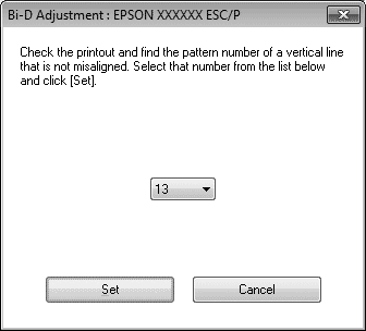 Look at the adjustment patterns and find the vertical line that is aligned the best. Then, select the corresponding line number in the Bi-D Adjustment window.