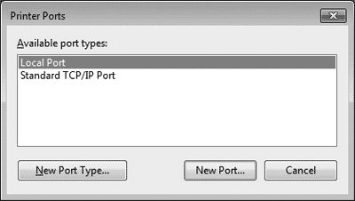 When the Printer Ports window appears, select Local Port, and then click New Port.