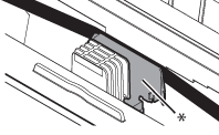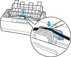 Insert the ribbon cartridge into the printer as shown; then press both sides of the cartridge firmly to fit the plastic hooks into the printer slots.