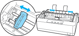 Slide the left sprocket using the arrow mark on the printer as a guide. The printer prints to the right of the arrow mark. Push the sprocket lock lever back to lock it in place. Then slide the right sprocket unit to match the width of your paper, but do not lock it. Move the paper support so it is midway between the sprocket units.