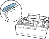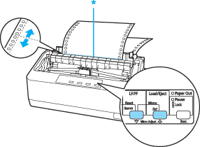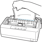 Press the LF/FF  button to feed the paper backwards, or press the Load/Eject  button to feed the paper forwards, until the paper perforation is aligned with the tear-off edge.