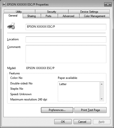 ![]() When you click Properties (Windows Vista, XP, and 2000) or Printer properties (Windows 7) in the menu displayed by right-clicking the printer icon, the Properties window appears, which includes menus used to make the printer driver settings.