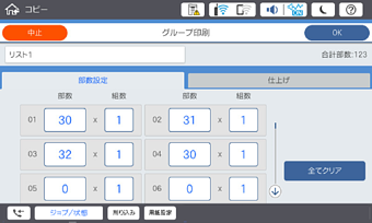 例えば、学校で1学年4クラス(1組:30人、2組:31人、3組:32人、4組:30人)向けの配布物を印刷する場合は以下のように設定します。