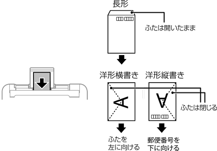 印刷する面を手前にして中央にセットし、用紙ガイドを封筒に合わせてください。