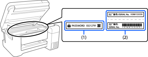 管理员密码的默认值打印在机身标签上,如图所示。贴标签的位置取决于产品,例如在产品里面(需打开打印机盖)、背面或底面。