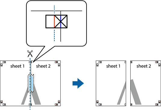 沿着经过左侧和右侧交叉标记中央的水平蓝色线条剪切 Sheet 1 和 Sheet 2 的边距。