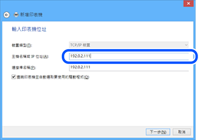5. 在[主機名稱或 IP 位址]或[印表機名稱或 IP 位址]輸入印表機的 IP 位址或印表機名稱,然後按下[下一步]。