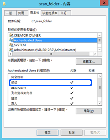若未選取,請選取[已驗證的使用者],按下[編輯],在[已驗證的使用者權限]中選取[修改]上的[允許],然後再按下 [OK]。
