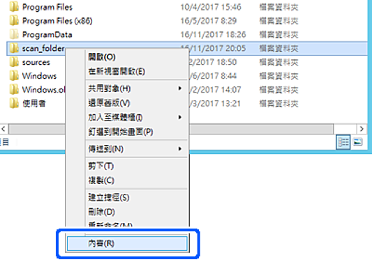 在資料夾上按下滑鼠右鍵,然後選取[內容]。