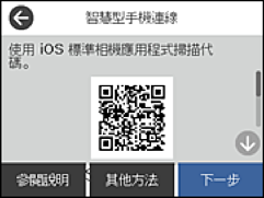 使用 iOS 11 或更新版本上的相機應用。使用 iOS 10 或更新版本上的相機應用無法連接至印表機。此外,使用掃描 QR 碼的應用也無法連接。如果您無法連接,請從印表機控制面板上選取 [其他方法]。有關連接的詳細說明,請參考以下相關資訊連結。