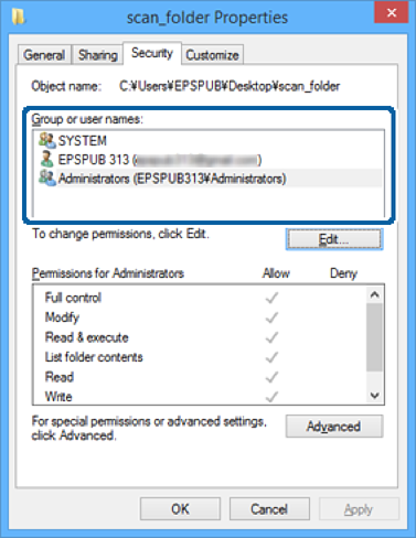 10. グループ名またはユーザー名]にあるグループまたはユーザーを確認します。