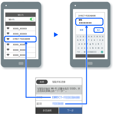 在智能设备的 Wi-Fi 屏幕上,选择本产品操作面板上显示的 SSID,然后输入密码。