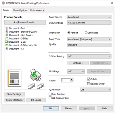 Vælg Indstillinger eller Egenskaber for at åbne printerdrivervinduet.