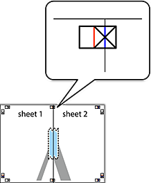 1. Forbered Sheet 1 og Sheet 2. Klip margenen af Sheet 1 langs den lodrette blå linje, som løber gennem midten af krydsmærket øverst og nederst på siden.