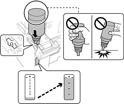 Juster toppen af blækflasken, så den flugter med påfyldningsåbningen, og træk den derefter lige ind i åbningen for at påfylde blæk til den øverste linje, til den stopper automatisk.