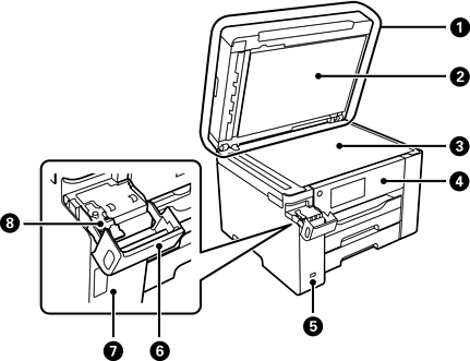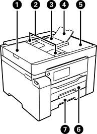Holds the ejected paper. When you start printing, this tray is ejected to fit the paper size automatically. To store the tray, push it manually or select |