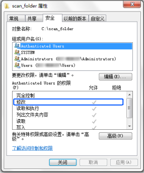 确认已在 Authenticated Users 的权限下选中了修改对应的允许。