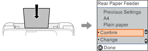 Dacă formatul și tipul de hârtie afișate diferă de hârtia încărcată, selectați Schimbare pentru a efectua modificările. Selectaţi formatul și tipul de hârtie, verificați setările și apoi apăsați butonul OK. Dacă setările se potrivesc cu hârtia încărcată, selectați Confirmare.