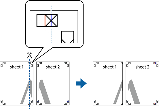 Sheet 1 و Sheet 2 را آماده کنید. حاشیههای Sheet 1 را از روی خط عمودی آبی که از مرکز تقاطعهای بالا و پایین میگذرد، ببرید.