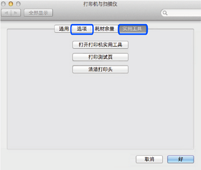 从 Apple 菜单中选择系统偏好设置 > 打印机和扫描仪(或打印和扫描打印和传真),然后选择打印机。单击选项与耗材,如果窗口上显示选项标签和实用工具标签,则表明您的计算机上已安装了正版爱普生打印机驱动程序。