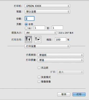 如果 macOS High Sierra、macOS Sierra、OS X El Capitan、OS X Yosemite、OS X Mavericks 或 OS X Mountain Lion 中未显示打印设置菜单,则表明未正确安装爱普生打印机驱动程序。从以下菜单启用爱普生打印机驱动程序。macOS Mojave 无法访问 Apple 制造的“文本编辑”等应用程序中的打印设置。