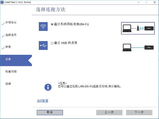 选择通过无线网络连接 (Wi-Fi) ,然后单击下一步。