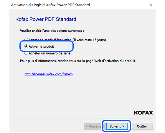 Power PDF Standard démarre et ouvre la boîte de dialogue d’activation. - Sélectionnez [Activer le produit], et cliquez ensuite sur [Suivant].